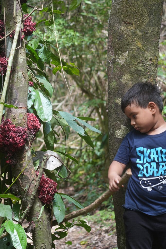 For the first time, I saw macambo (Theobroma bicolor) being planted intentionally at scale as a shade tree for cacao. Macambo is a close relative of cacao, producing large, pale pods filled with edible seeds that can be roasted and eaten like nuts. It’s an exciting companion species — offering shade, improving soil health, and providing an additional crop for farmers. Seeing it integrated into cacao systems was truly promising, a sign of innovation grounded in biodiversity.