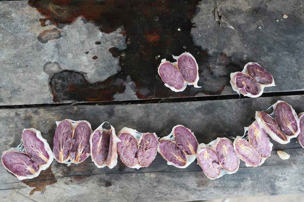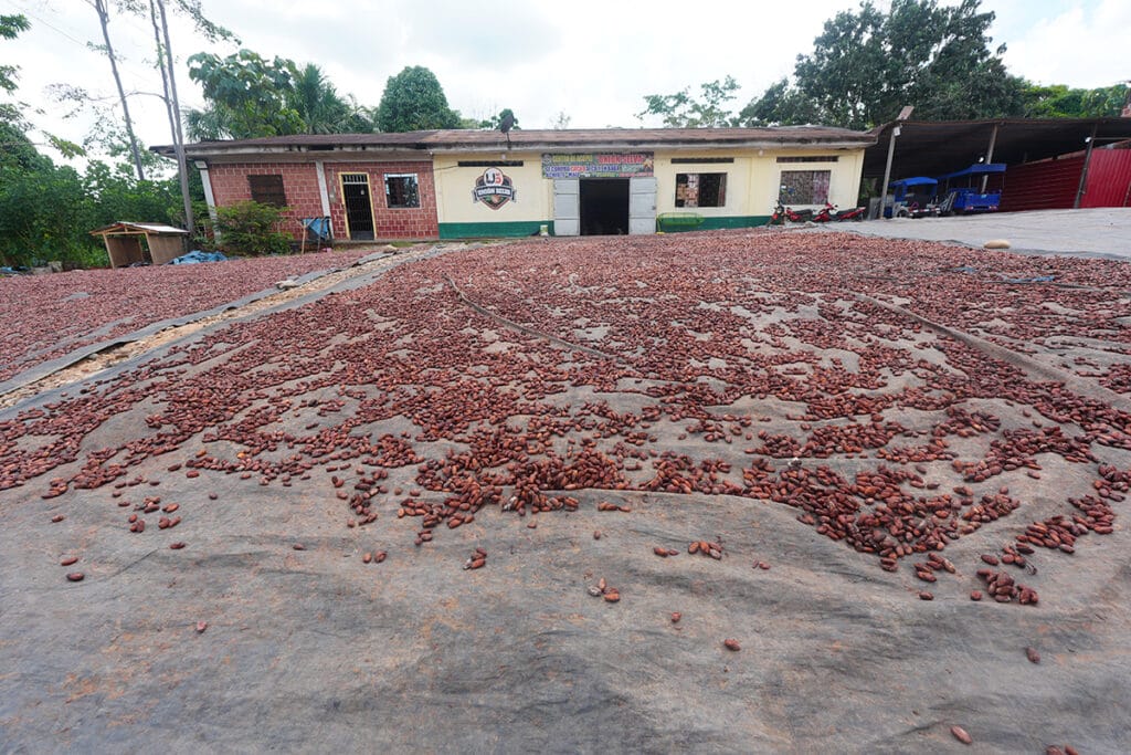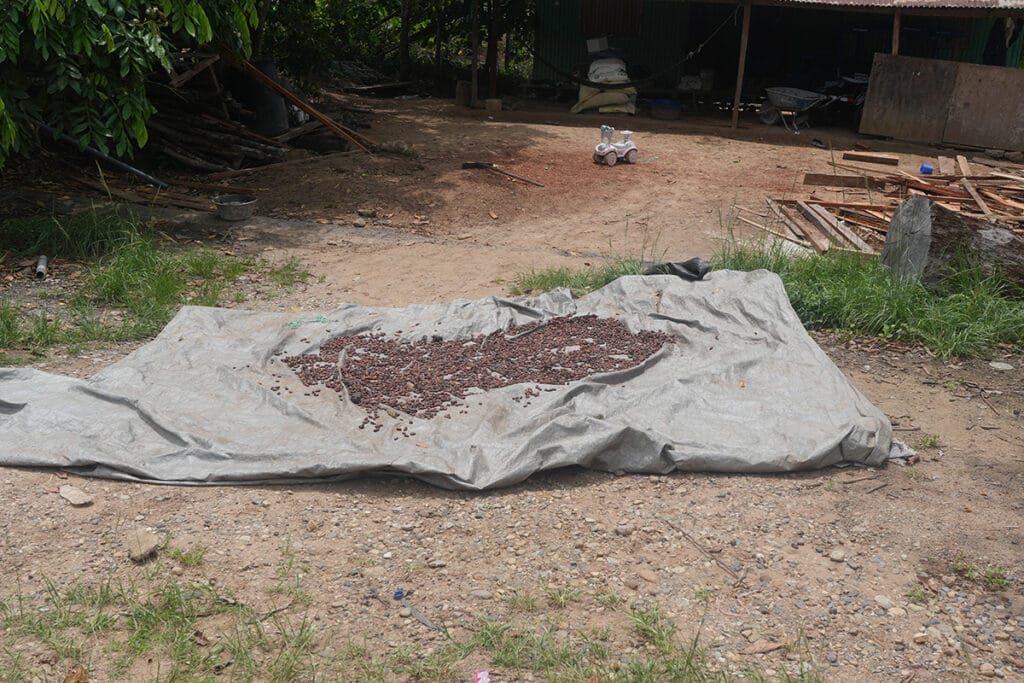 The journey wasn’t without its wild moments. While walking through one cacao farm, I startled two large snakes sunning themselves among the fallen leaves — a sharp reminder that these forests are alive in every sense. Later, while filming some poorly dried cacao laid out beside a street, I was suddenly chased off by a pair of vicious guard dogs. Both encounters were brief but unforgettable — a glimpse of the raw, unpredictable reality that surrounds cacao farming in the jungle.